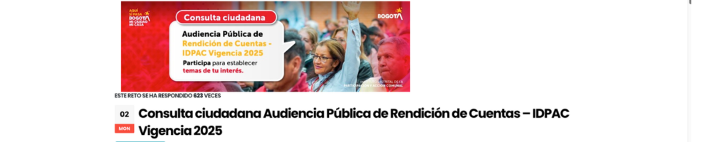 El Instituto Distrital de la Participación y Acción Comunal – IDPAC invita a la ciudadanía, organizaciones sociales, comunales, instancias de participación, Consejos de Propiedad Horizontal, y demás espacios y procesos comunitarios a participar en esta consulta ciudadana, cuyo objetivo es recoger insumos para definir los temas prioritarios de la Audiencia Pública de Rendición de Cuentas de la vigencia 2025.